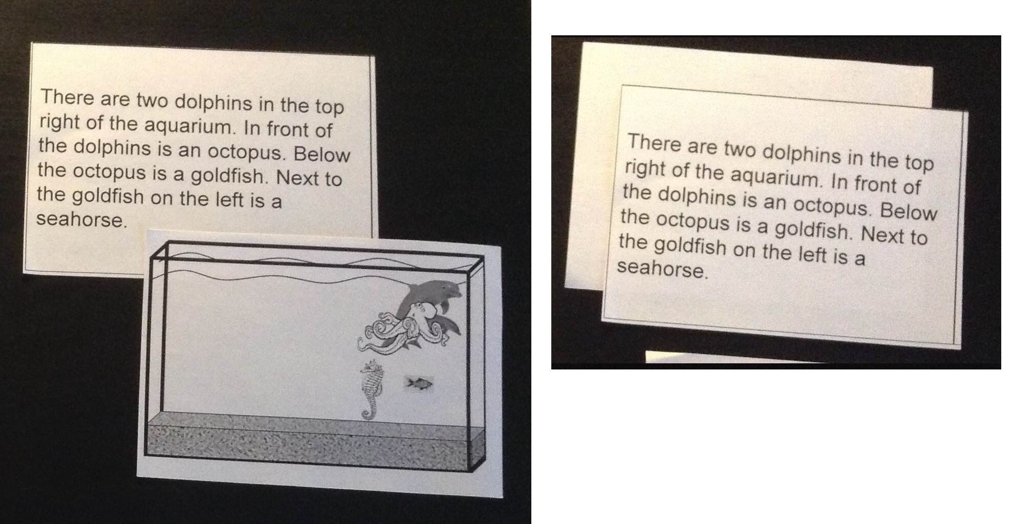 Students re-read the first description and follow the directions on the card, moving the pictures into place. When they think they have the correct answer they can check the picture underneath.