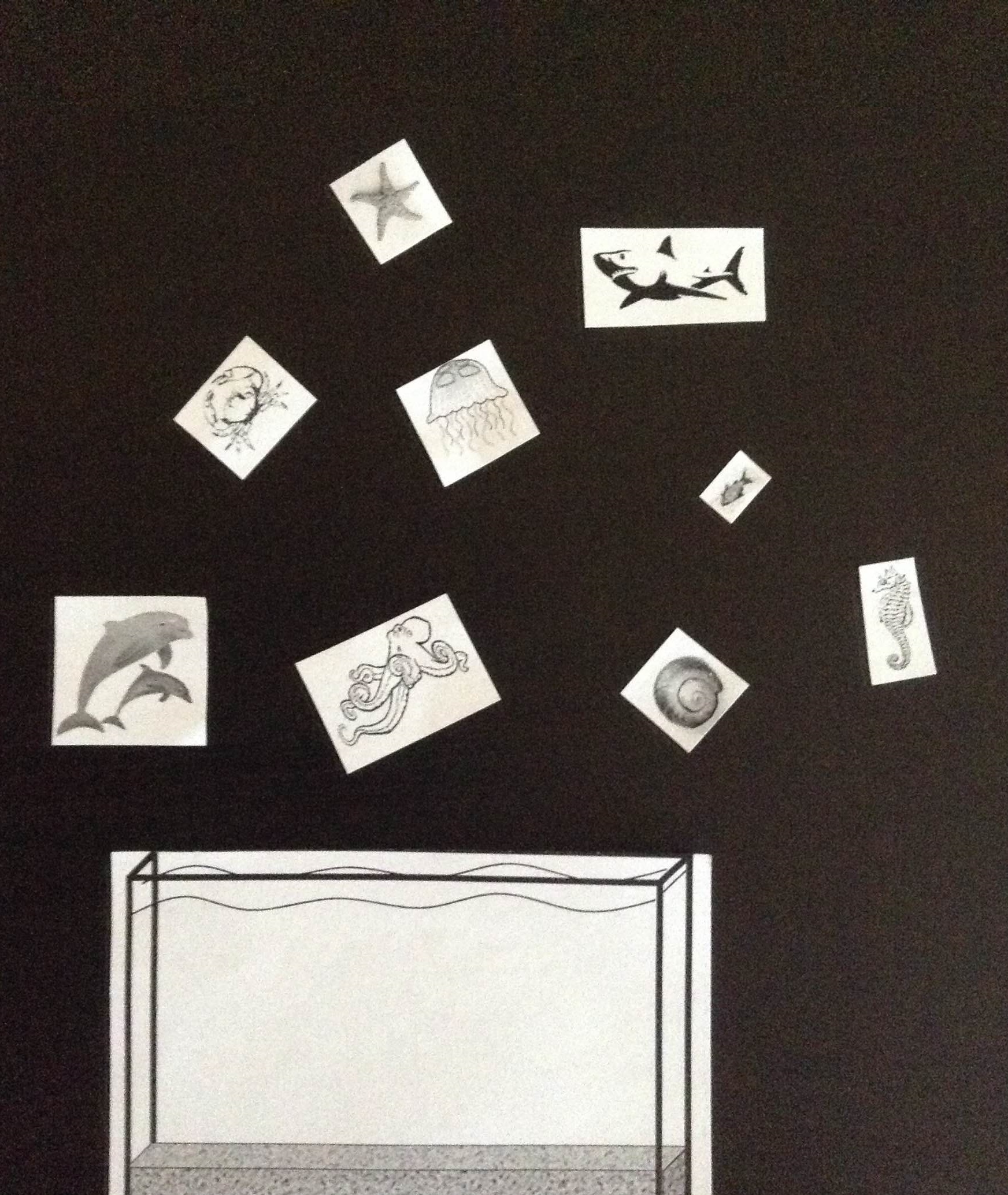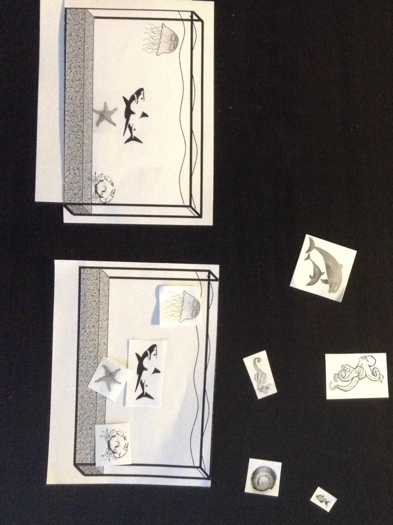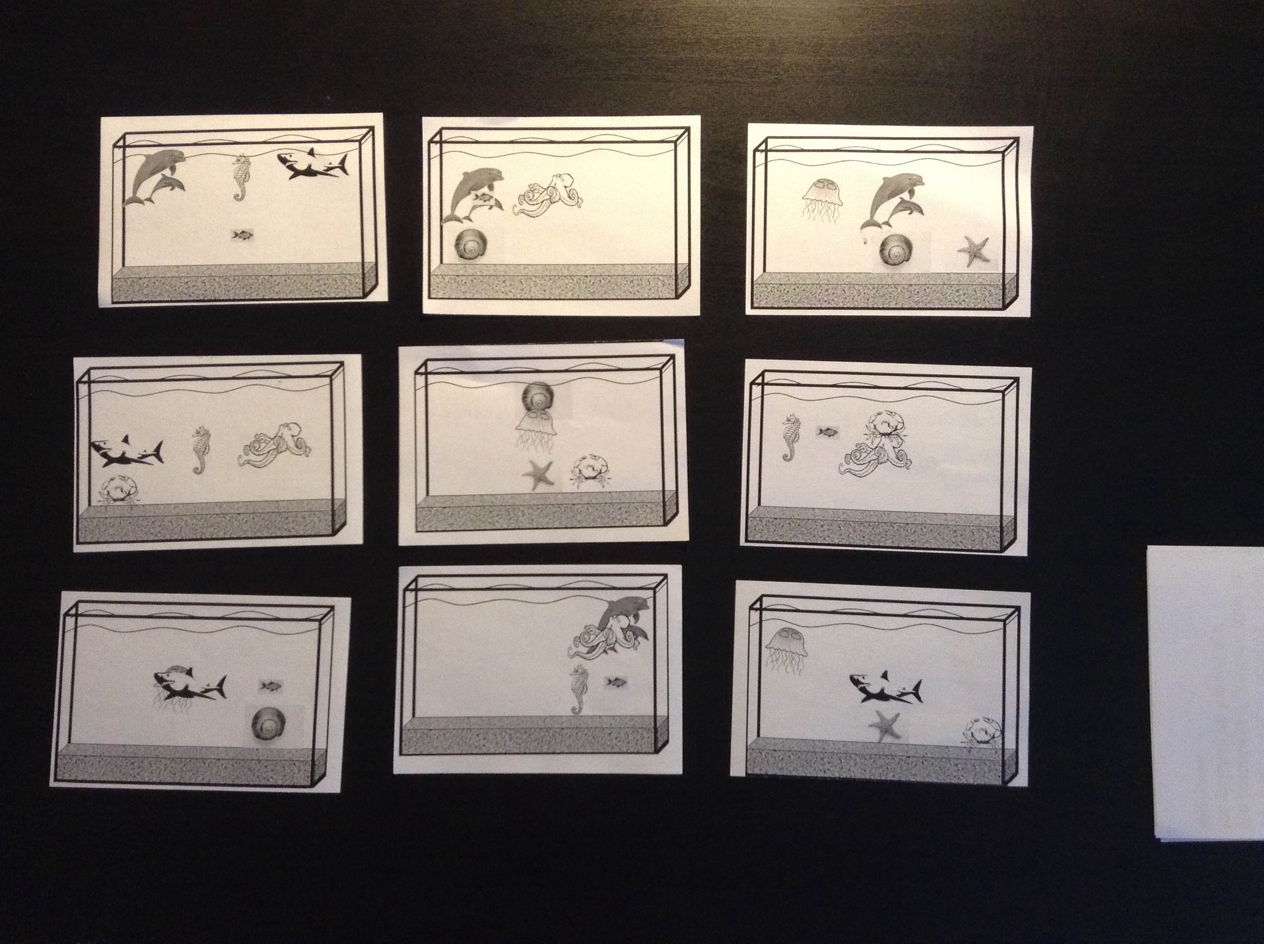 Once the students have finished matching up the descriptions they are given their own aquarium card with cut-out sea-life. They will use these cards to recreate the aquarium pictures from the first part of the game by following the descriptions. This is the core part of the game.
