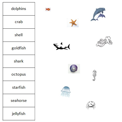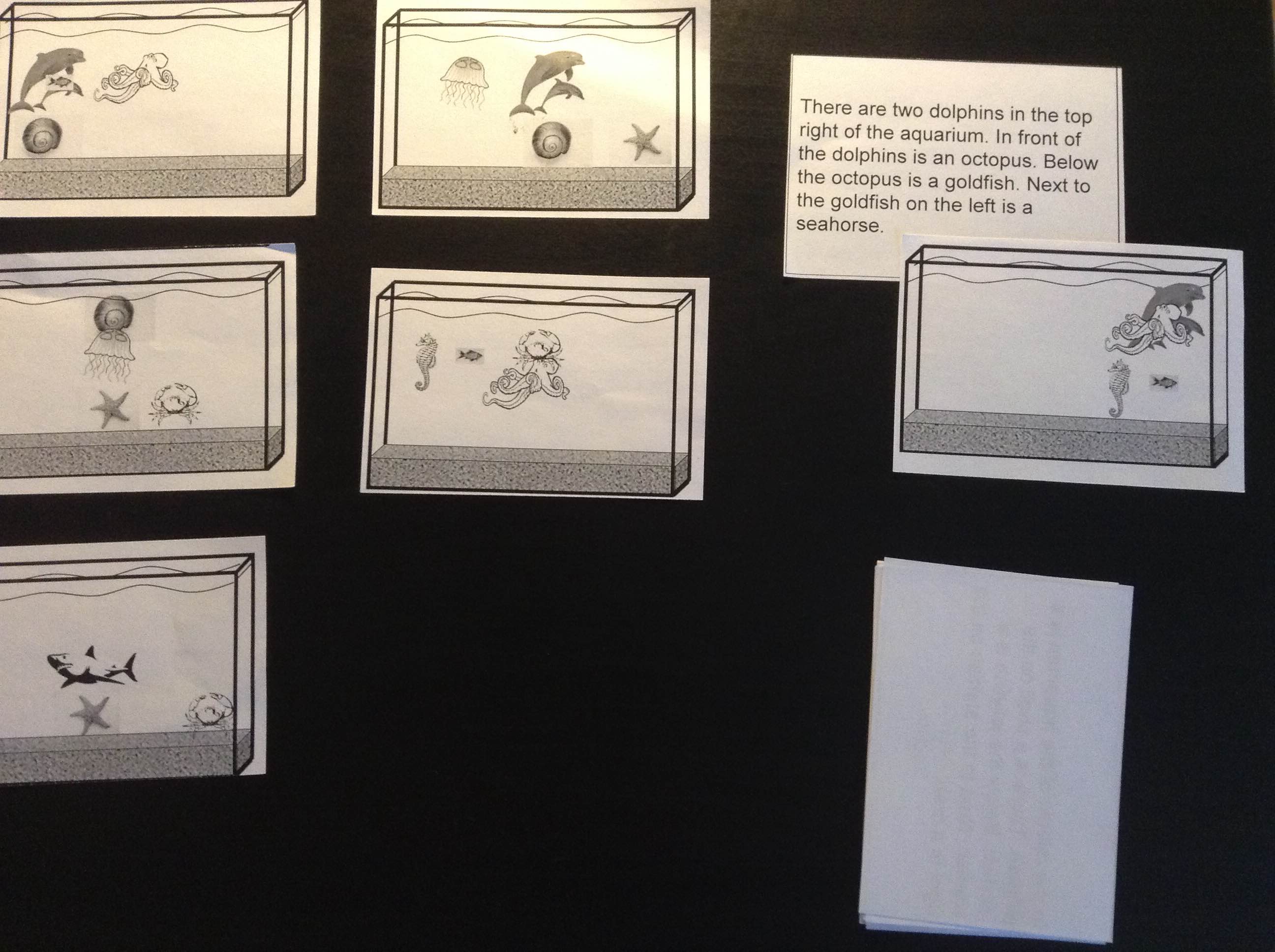 Students take the first description card, read it together and then find the aquarium picture that matches the description. They put the matched cards to one side.