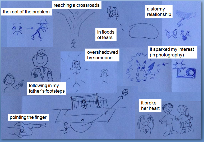 I’ve made 20 cards representing the 20 metaphors we’d learnt in the previous lesson. The two with examples are the ones that students found most difficult.
