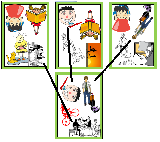 The top three cards represent players and the bottom card is the one that has just been turned over. Each player has to find the one picture that is on both their own card and on the new card. If the middle player says “he’s brushing his teeth” before the other players say their sentence, then the middle player wins the card and he puts it face up over his old card.